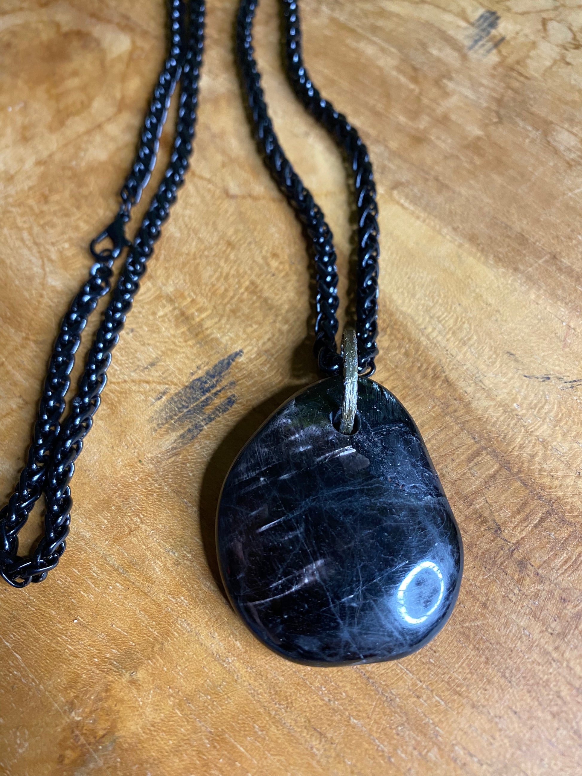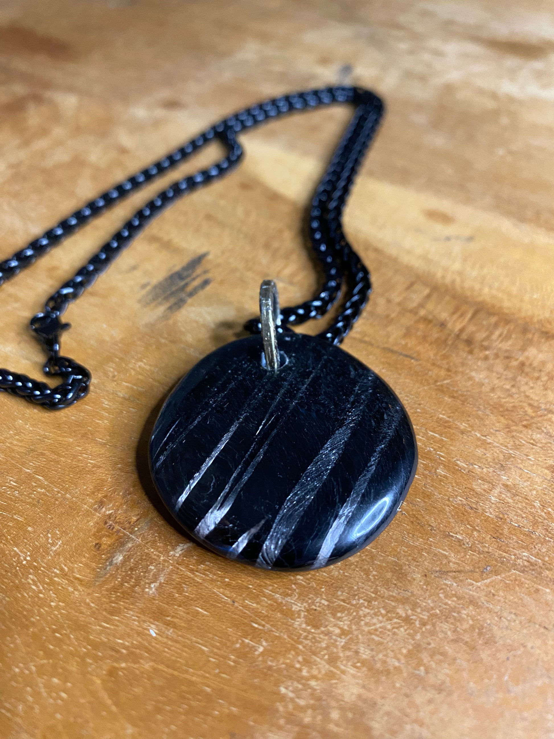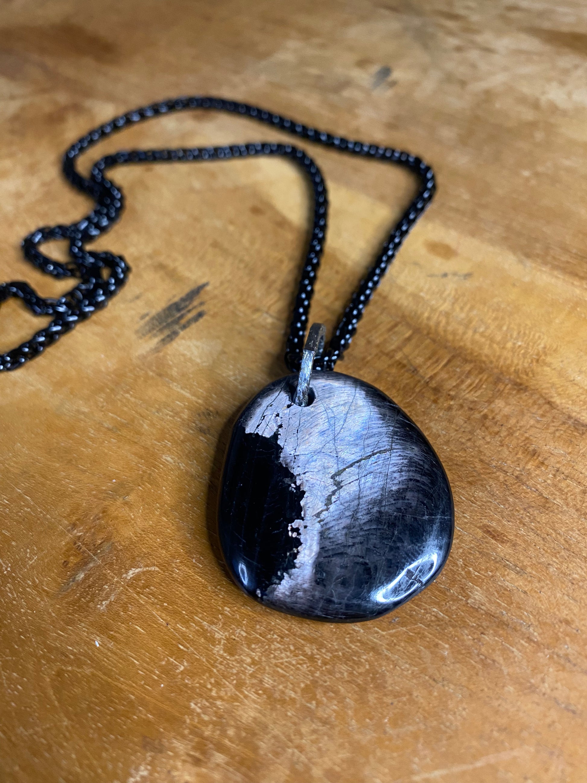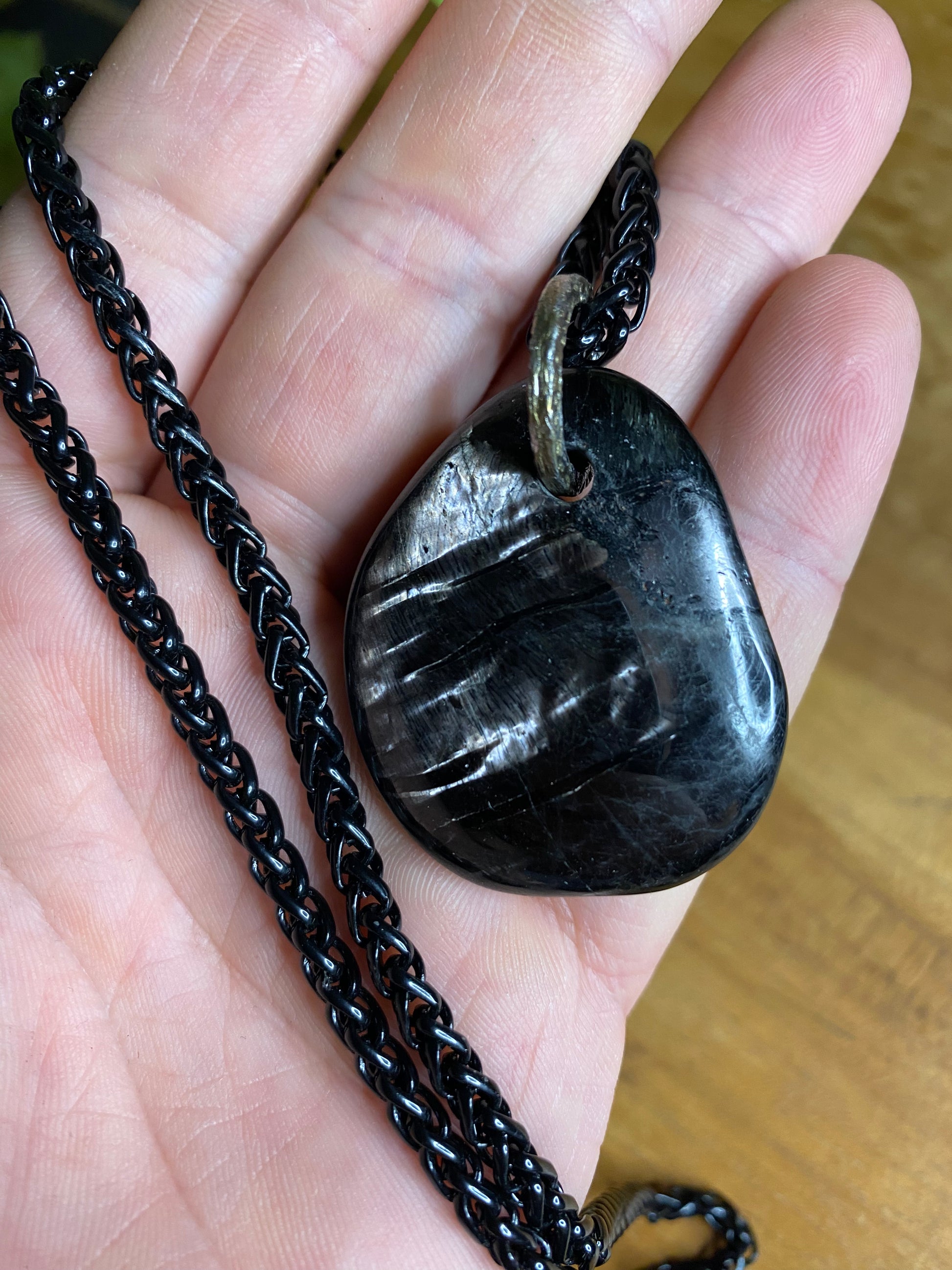 Shadow Ember is diepzwart met subtiele zilver- en paarse glans, alsof je een stukje nachtelijke hemel bij je draagt. Elke ketting met Shadow Ember straalt bescherming, kalmte en innerlijke kracht uit. De ketting is verkrijgbaar in een lengte van 60 cm.