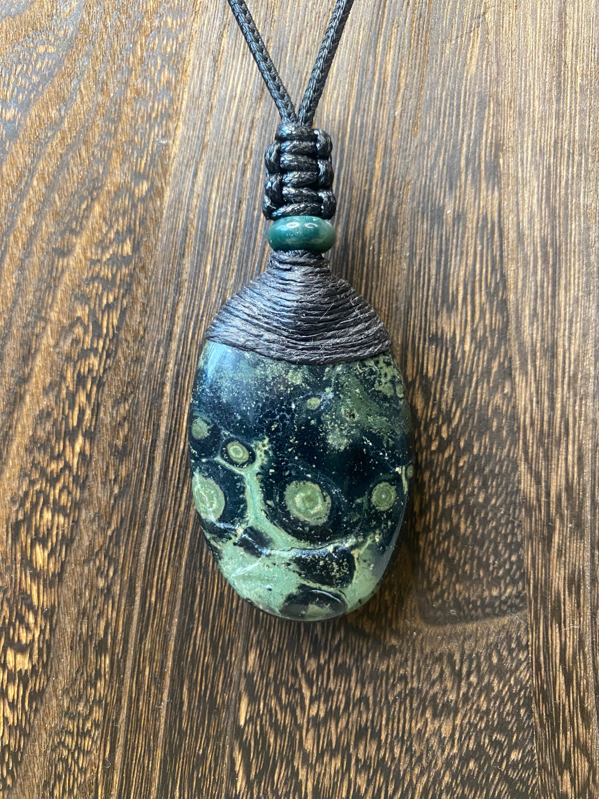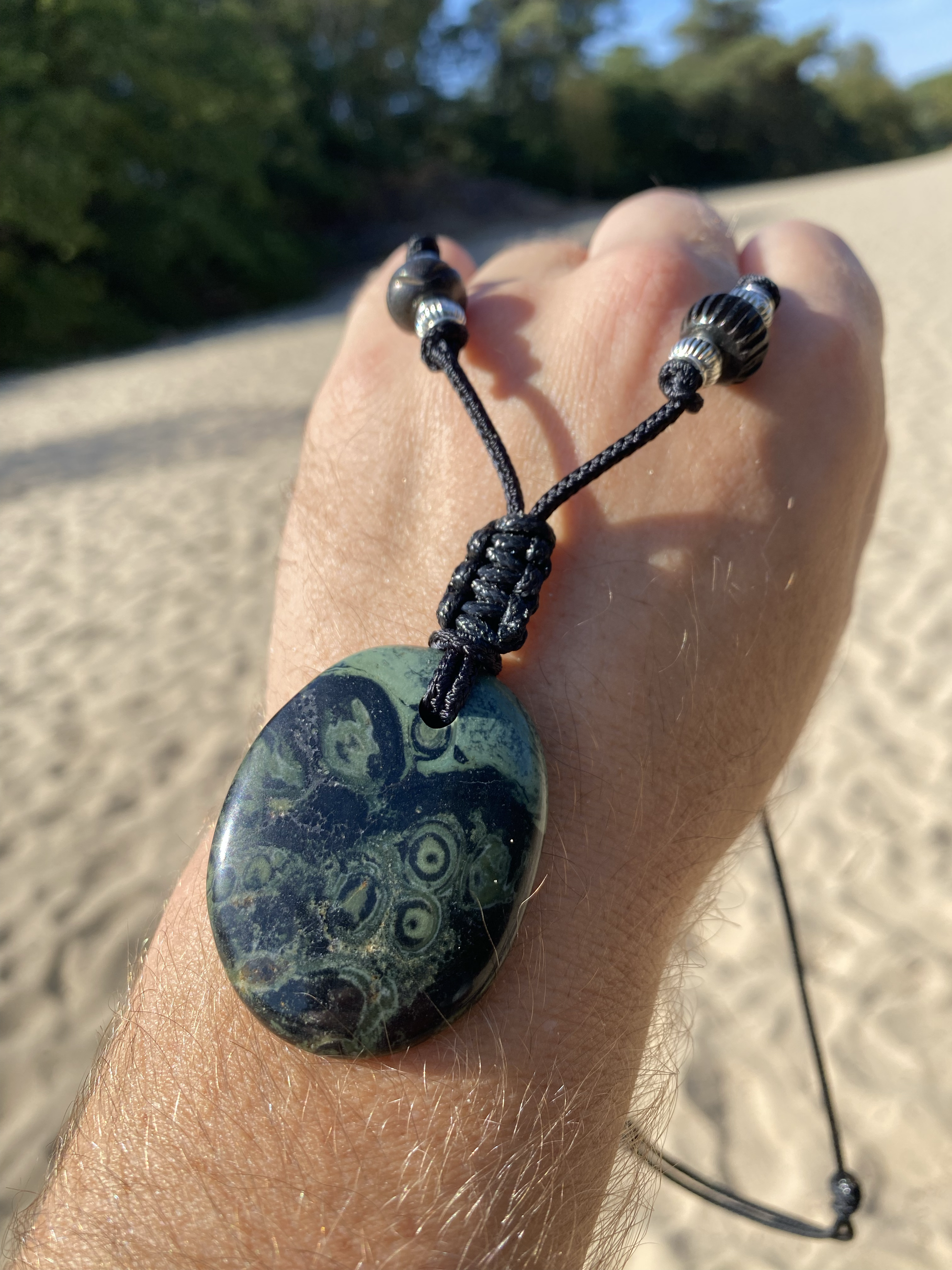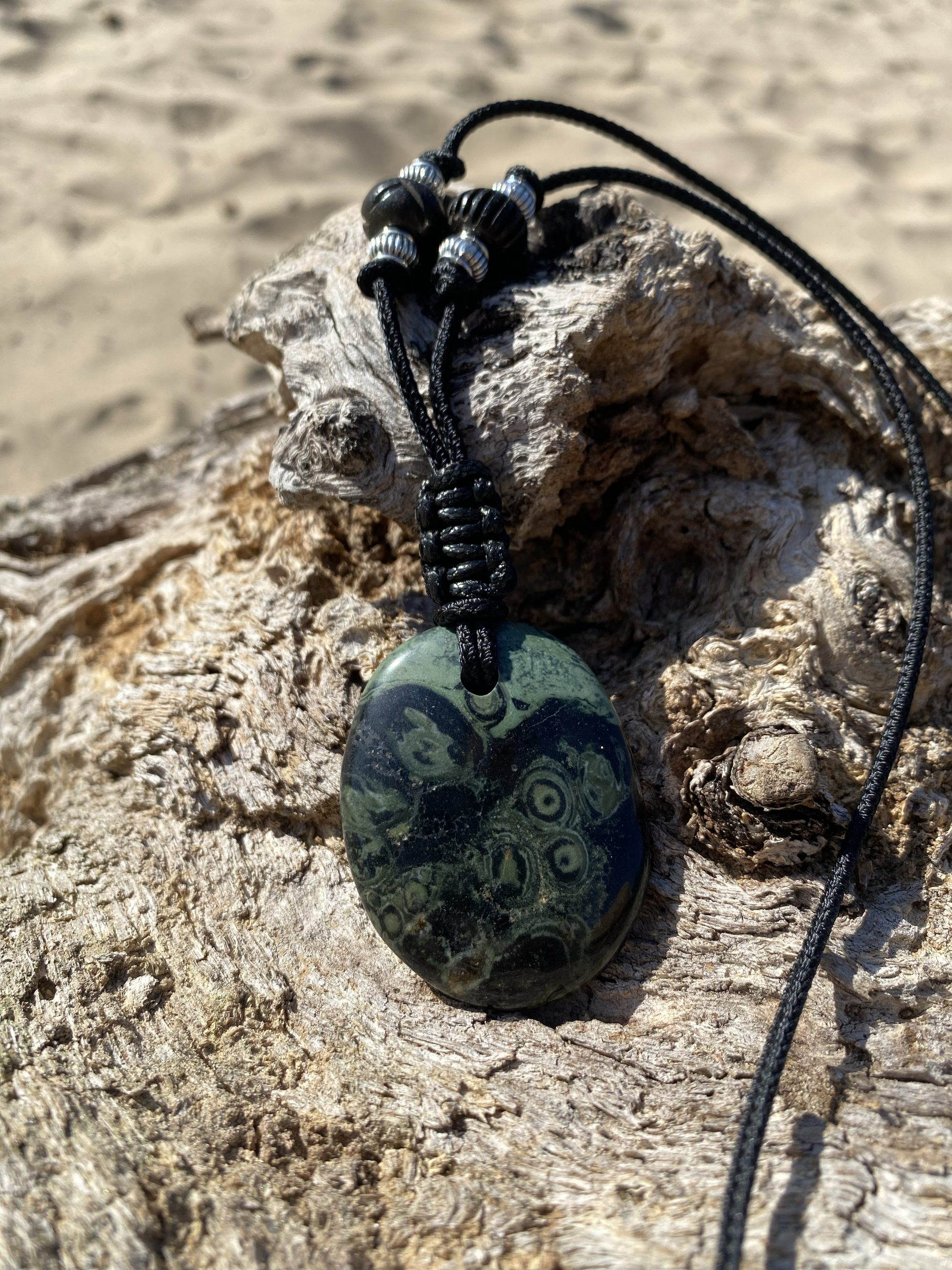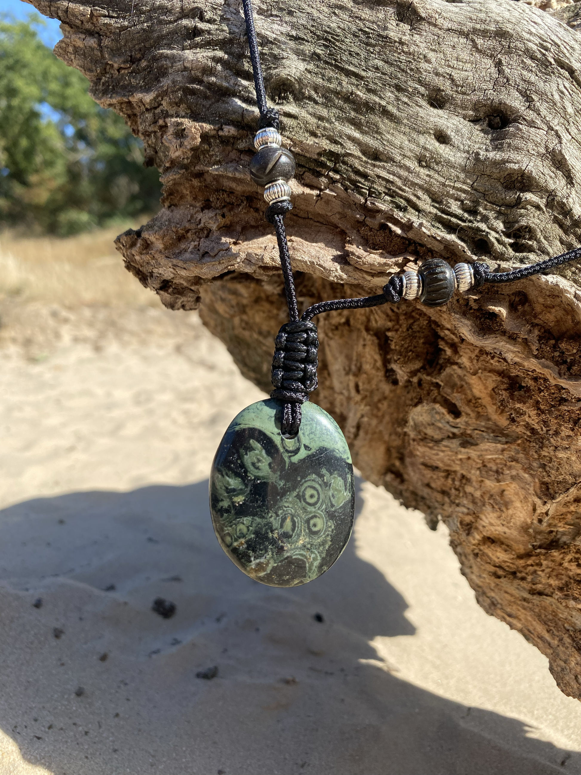 The Soul of Kambara heeft diepe groene tinten met zwarte patronen, alsof je een stukje oeroud bos en natuurlijke energie bij je draagt. Elke ketting met The Soul of Kambara straalt rust, stabiliteit en innerlijke kracht uit, en nodigt uit om gegrond en gefocust te blijven.