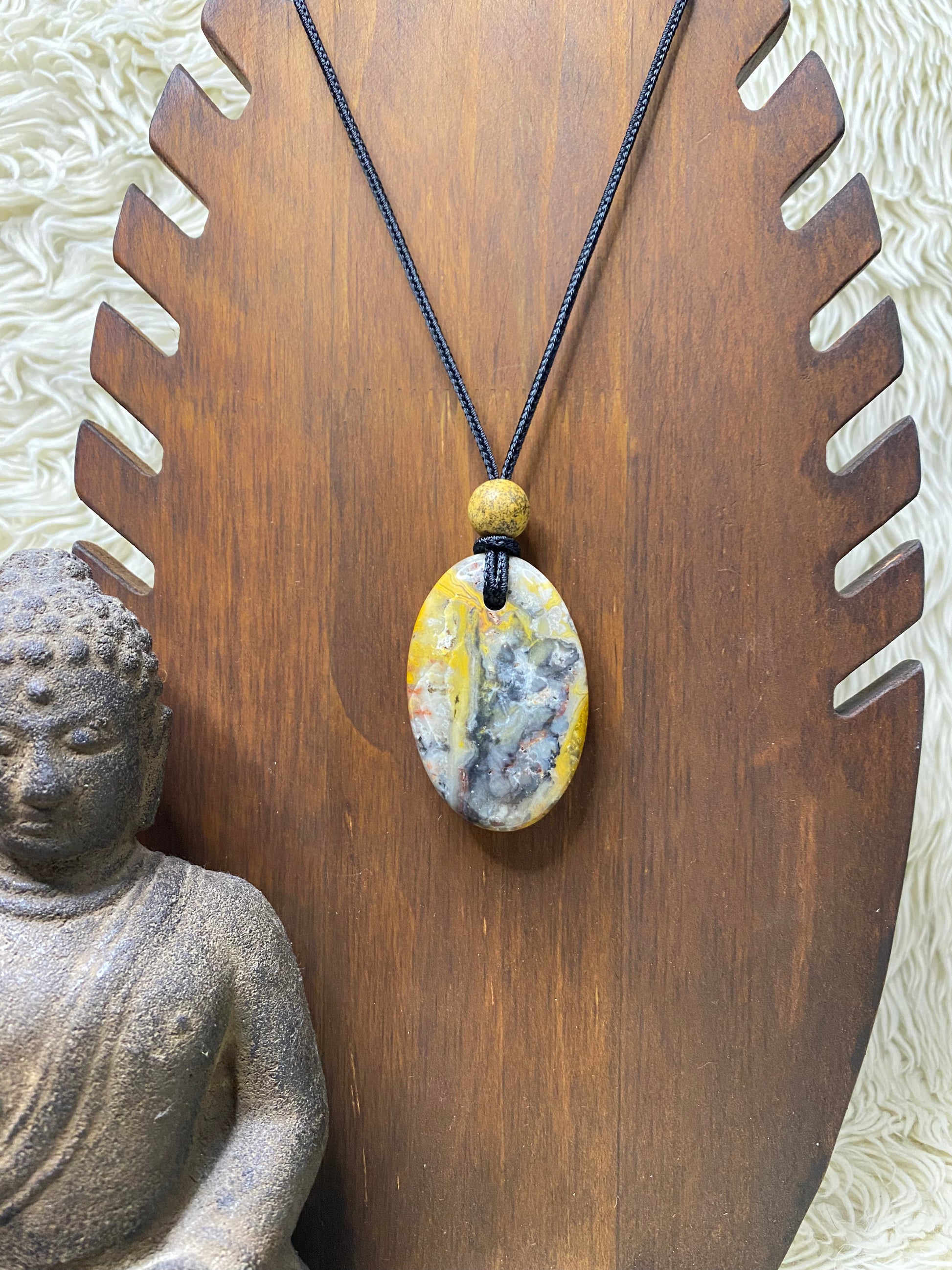 Sunfire Lace lijkt alsof hij de vurige kleuren van de zon zelf heeft gevangen, met warme rood- en oranjetinten die speels door donkere lijnen en vlekken lopen. Elke ketting met Sunfire Lace straalt energie, vitaliteit en een krachtige uitstraling uit, alsof je de zon in je handen draagt. De ketting komt in een verstelbare lengte die zich moeiteloos laat aanpassen.